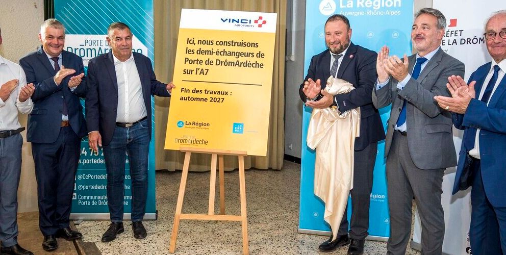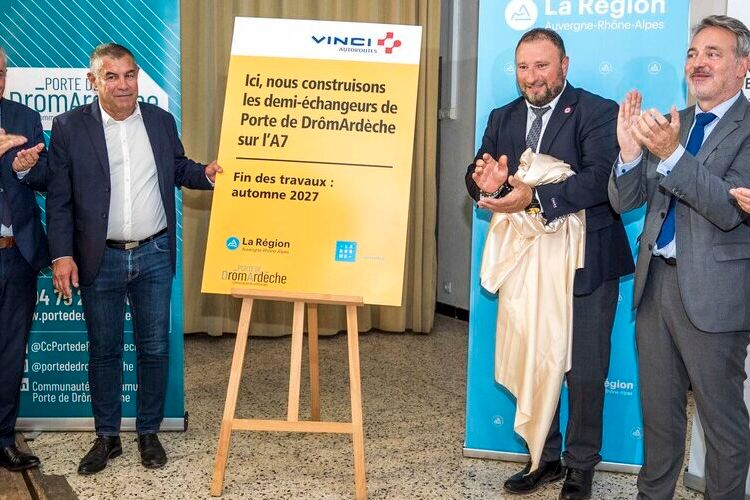 Florent BRUNET, Président de la Communauté de communes Porte de DrômArdèche et représentant la Région Auvergne-Rhône-Alpes, Jean-Michel AVIAS, Vice-président du Conseil départemental de la Drôme, chargé de la sécurité, des infrastructures et des mobilités actives, Ludwig MONTAGNE, Maire de Saint-Barthélemy-de-Vals, Gérard ORIOL, Maire de Saint-Rambert-d’Albon, Cyril MOREAU, Secrétaire général de la Préfecture de la Drôme, Sous-préfet de l’arrondissement de Valence, et Xavier RICHER DE FORGES, Directeur Maîtrise d’Ouvrage Est de VINCI Autoroutes, accompagnés de nombreux élus, ont posé la première pierre du chantier de création des demi-échangeurs de Porte de DrômArdèche sur l’autoroute A7.