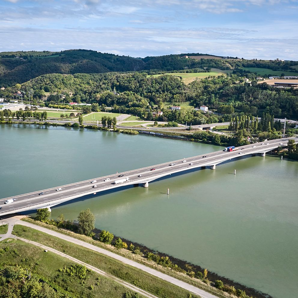 Long de 413 mètres, le viaduc de Vienne Sud franchit le Rhône entre Reventin-Vaugris (Isère) et Ampuis (Rhône). Mis en service en 1973, il se compose de cinq travées et de deux tabliers en béton précontraint, l’un pour chaque sens de circulation. Après près de cinquante ans d’existence, cet ouvrage clé du couloir rhodanien a fait l’objet d’ une opération de rénovation d’ampleur.
