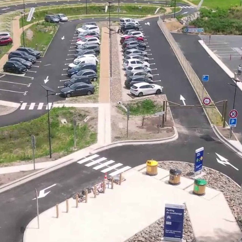 Pour réduire l’empreinte carbone de la construction de cette nouvelle infrastructure la totalité des agrégats d’enrobés rabotés sur l’ancienne bretelle autoroutière ont été recyclés. Les places de parking, réparties sur une surface de plus de 8 800 m2, disposent toutes d’un revêtement perméable, issu d’un béton bas carbone fabriqué à partir d’argile crue. Pour la préservation de la ressource en eau, tout le ruissellement est recueilli à travers un dispositif de noues d’infiltrations, permettant de le traiter par biodégradation, avant son rejet dans le milieu naturel. La consommation d’énergie a également été optimisée avec un éclairage public qui utilise des lampadaires photovoltaïques à LED. Pour réduire et limiter leur consommation, tous ont été équipés de détecteurs de présence et d’une modulation d’éclairage en fonction de l’horaire. Enfin, une quinzaine d’arbres et arbustes, d’essences locales (pin maritime, chêne liège) ont été plantés pour recréer des espaces ombragées et arborées.