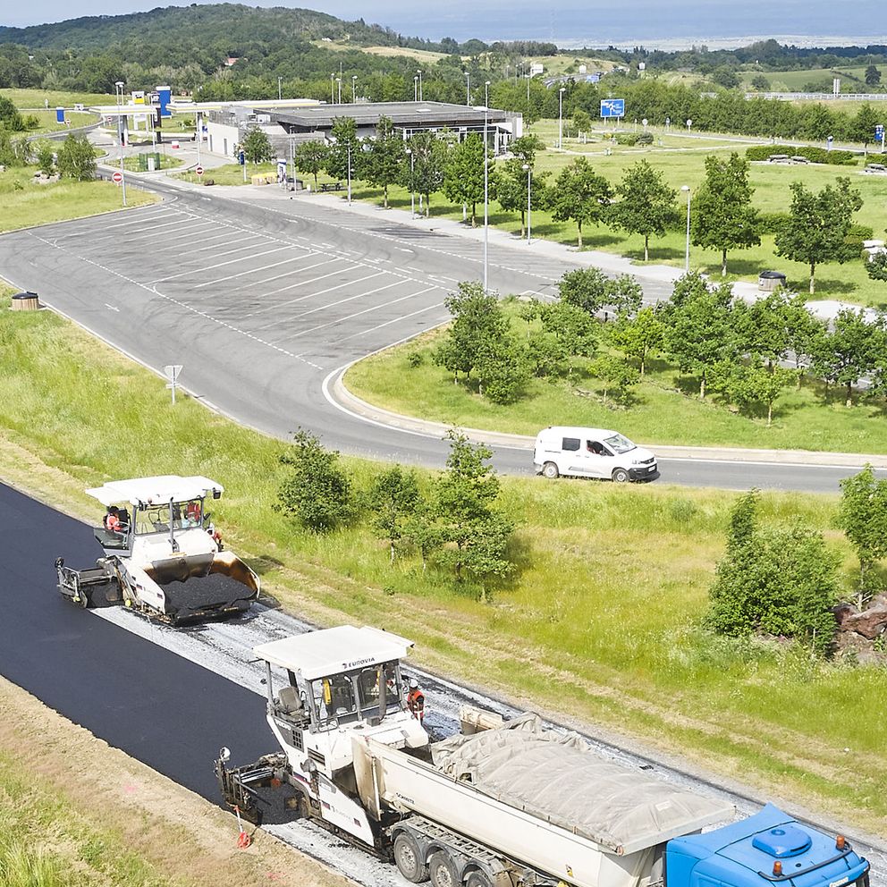 Le nouvel enrobé de cette section de l’A89 est composé à 58% de l’ancienne chaussée. 76% de cet ancien enrobé seront réutilisés sur ce chantier, les 24% restants seront recyclés dans d’autres chantiers.