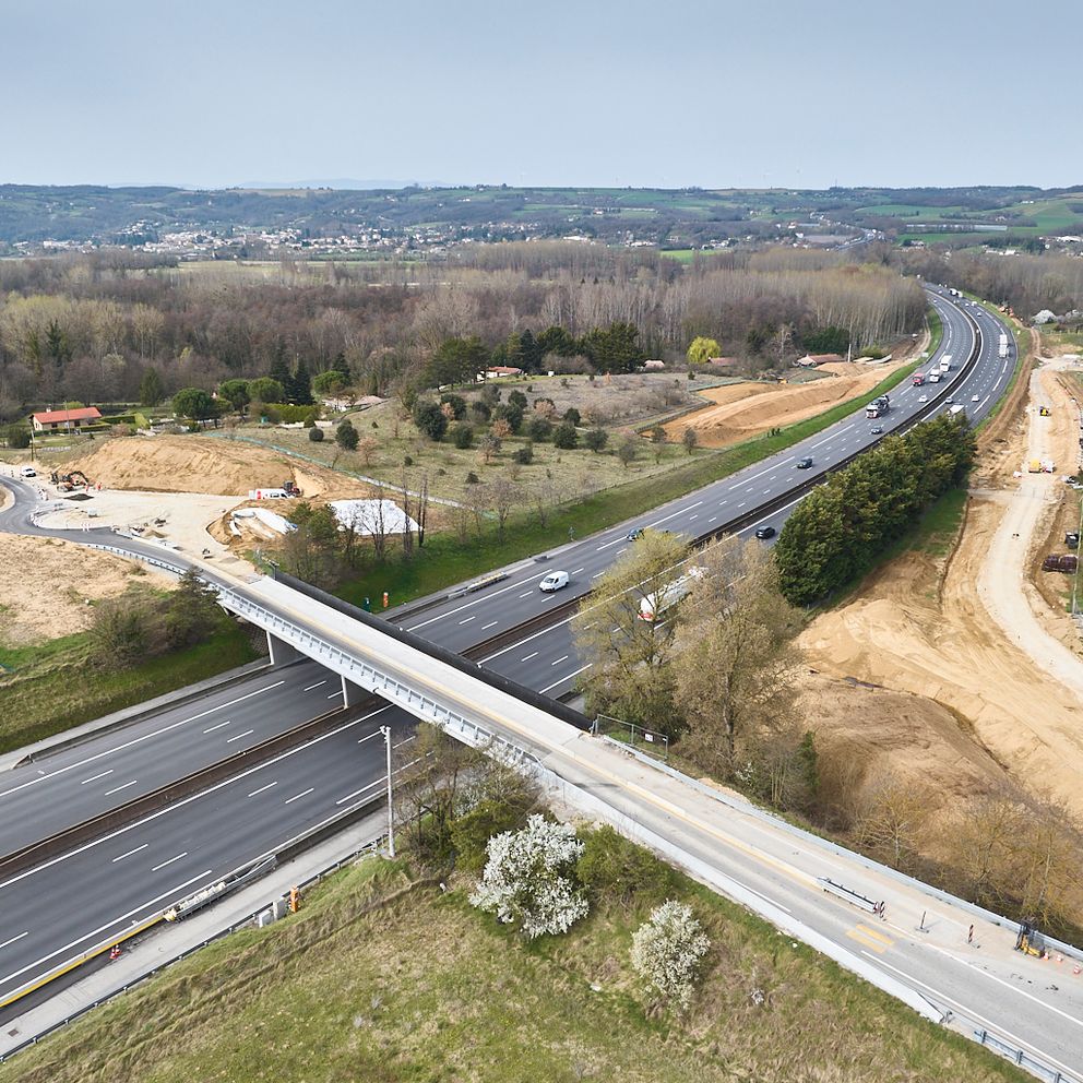 Les travaux se concentrent sur le raccordement du futur demi-échangeur au réseau départemental la RD112 : création du nouveau giratoire et terrassement de la bretelle d’entrée sur A7. La construction des écrans acoustiques côté hameau de Villeneuve de Vals a démarré. Les travaux d’étanchéité et de changement des dispositifs de retenue sur le pont de la RD 112 vont démarrer le 3 avril 2026. La création du nouveau giratoire sur la RD112 au niveau de la future bretelle de sortie se poursuit.