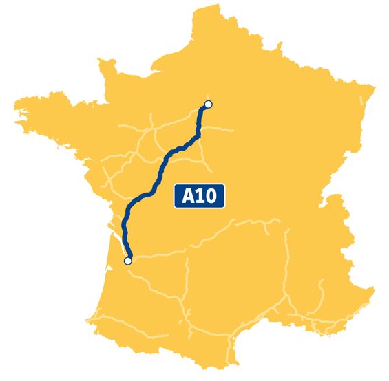 L’autoroute A10, dite « l’Aquitaine », relie Paris à Bordeaux sur 543 km. Axe structurant du réseau VINCI Autoroutes, elle supporte d’importants flux de transit nationaux et internationaux tout en assurant les déplacements quotidiens des territoires qu’elle traverse, de la Beauce au Bordelais en passant par le Val de Loire. Cette infrastructure fait l’objet d’un programme permanent d’entretien et de modernisation pour garantir un haut niveau de sécurité et de confort. Les interventions portent sur le renouvellement régulier des chaussées, la maintenance des nombreux ouvrages d’art et la mise à niveau technique des équipements de gestion du trafic. Ces opérations permettent d'adapter l'autoroute à l'augmentation des échanges et aux nouvelles attentes des voyageurs.
