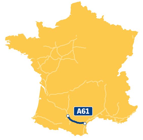 L’autoroute A61 relie Toulouse à Narbonne, partie Est de « l’Autoroute des Deux Mers », assurant la liaison entre façade Atlantique et Méditerranée. Son tracé traverse la Haute-Garonne et l’Aude, territoires marqués par des paysages agricoles et viticoles, en longeant aussi par endroits le canal du Midi. L’A61 accompagne ainsi les flux de transit et du quotidien, en reliant pôles urbains, territoires agricoles et sites touristiques majeurs, entre Toulouse, Carcassonne et le littoral méditerranéen.
