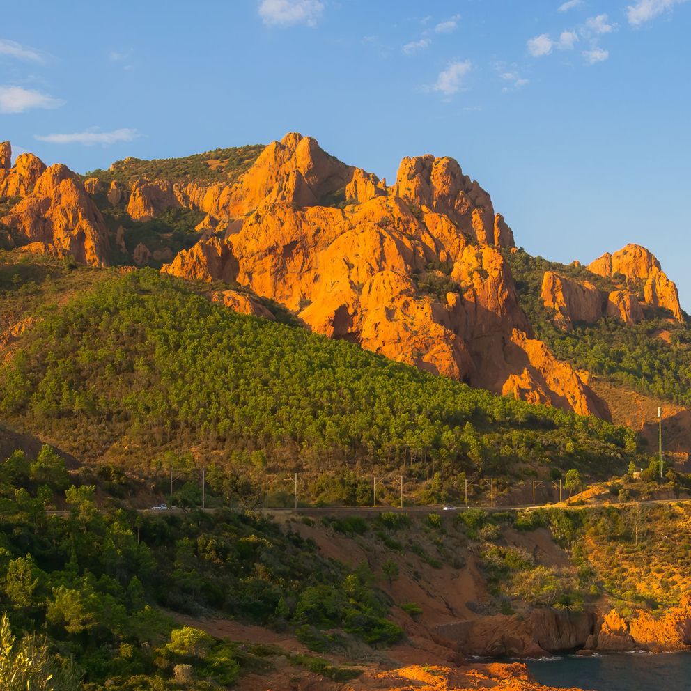Après Saint-Raphaël, vous arrivez sur le cap du Dramont qui vous promet un panorama vivifiant sur l’île d’Or et sa tour solitaire. Mais le plus beau reste encore à venir. Dépassez les rondeurs de la baie d’Agay, une petite station balnéaire, et rejoignez les calanques d’Anthéor. C’est ici que le spectacle naturel prend toute sa splendeur, avec ses eaux turquoise contrastant avec les roches écarlates. Si l’appel de la route est plus fort que celui des sentiers, continuez votre escapade sur la magnifique Corniche d’or.